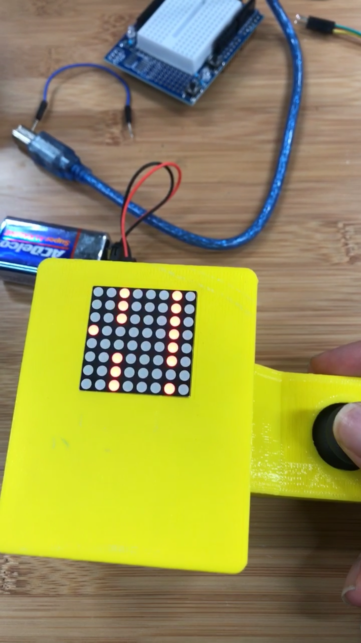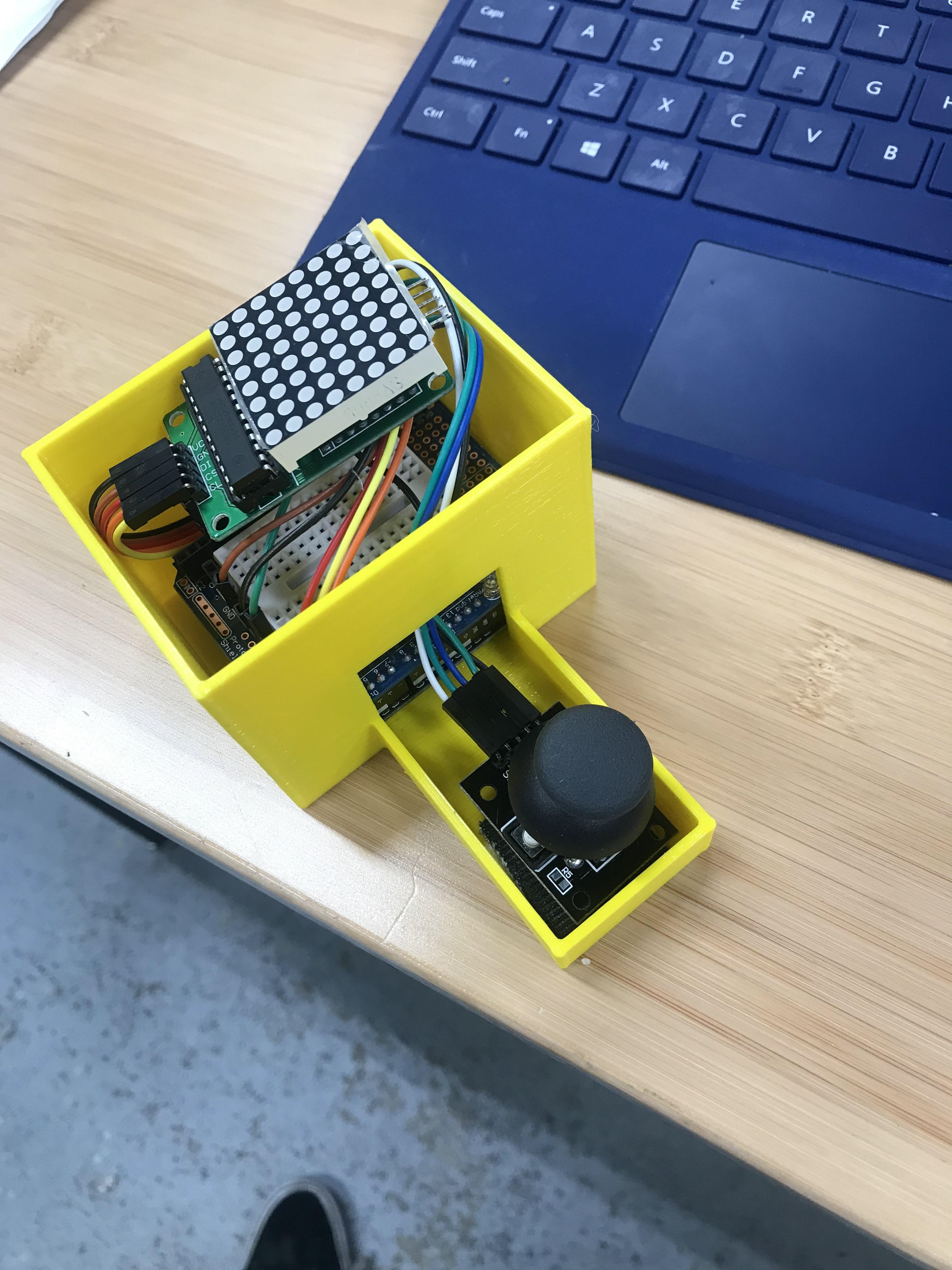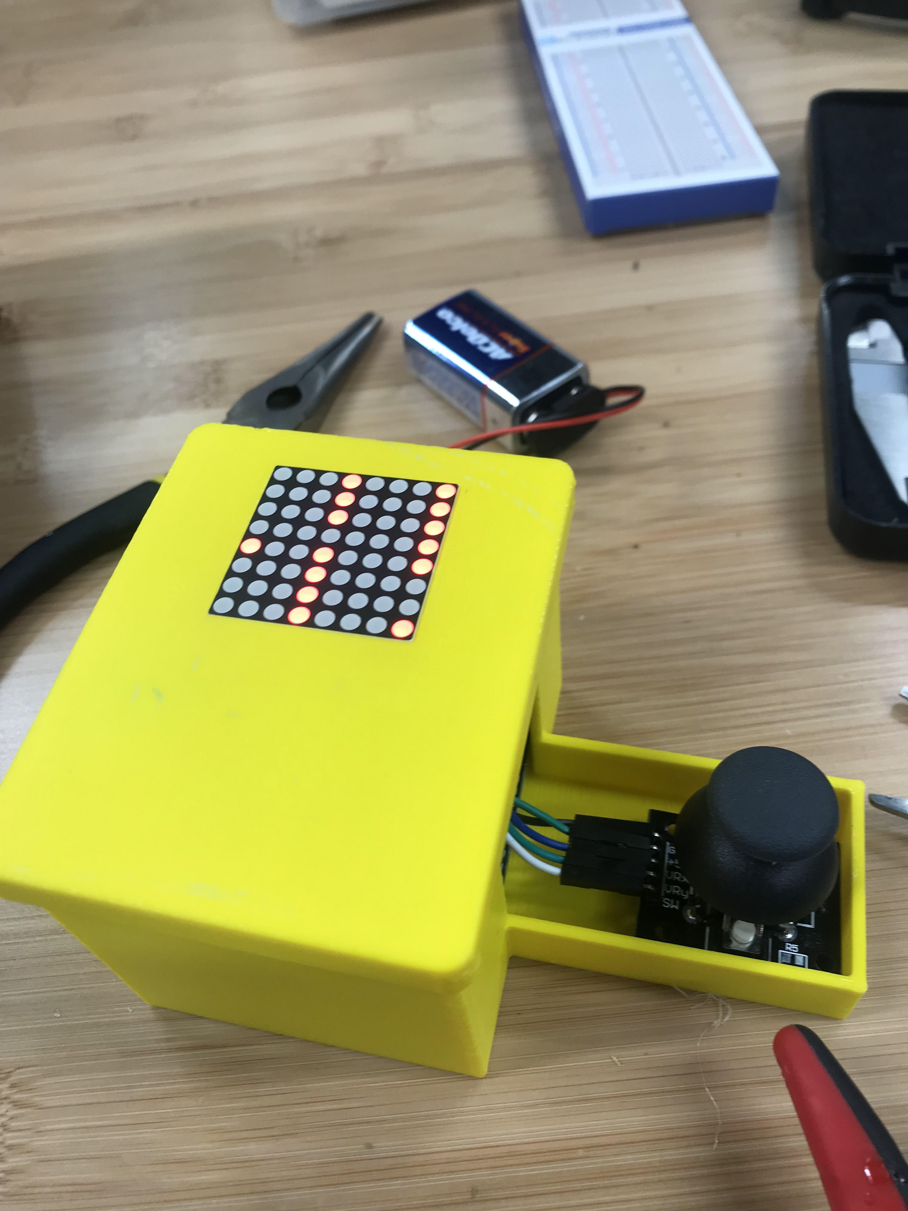 The objective of this game is to weave a ball through the holes in the walls using the joystick. If the player passes through ten walls then the ball moves one space up. After fifty walls, the player wins the game and giant “W” appears on the display. But if at anytime the player runs into a wall, they lose and an “L” will be displayed on the 8x8 LED matrix.